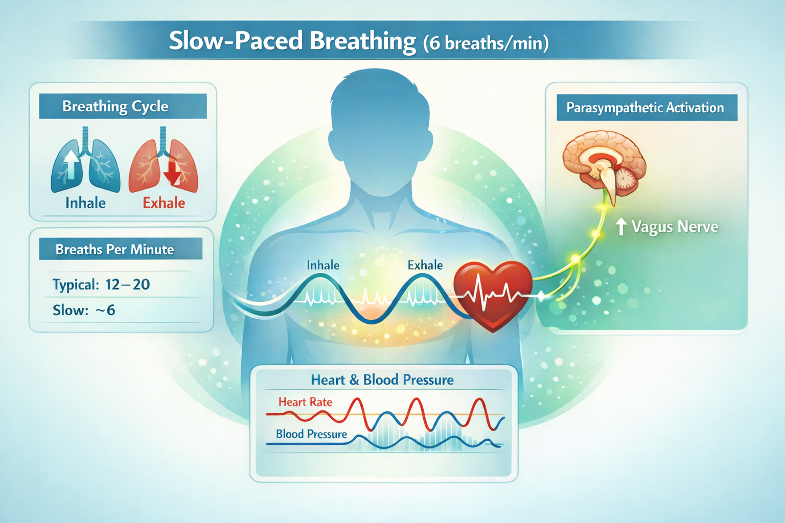 Slow-paced breathing is a deliberate technique where you slow your breath to about six breaths per minute, usually with longer exhales, to voluntarily reduce your respiratory rate and enhance mind–body regulation. It reliably increases parasympathetic (vagal) activity and heart-rate variability, helping reduce stress and improve emotional well-being while strengthening cardiorespiratory coupling.