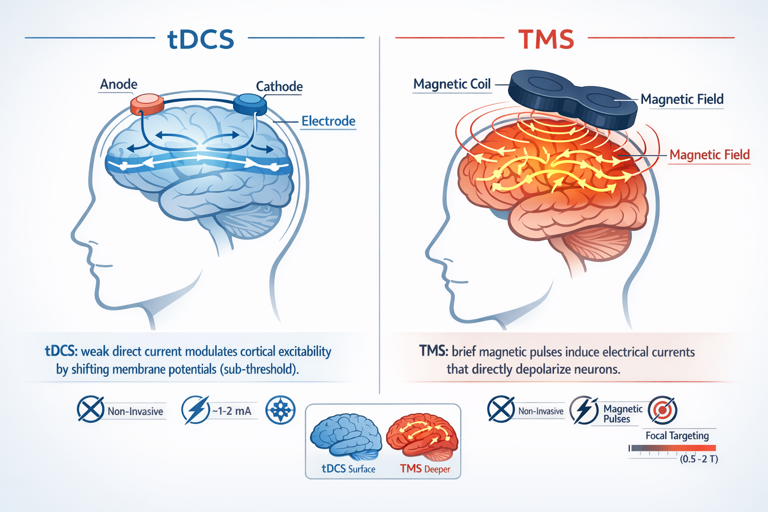 TMS uses brief magnetic pulses generated by a coil near the head to induce electrical currents in specific brain regions, directly influencing neural activity non-invasively. Because the magnetic field penetrates the skull, TMS can activate neurons more directly than tDCS.