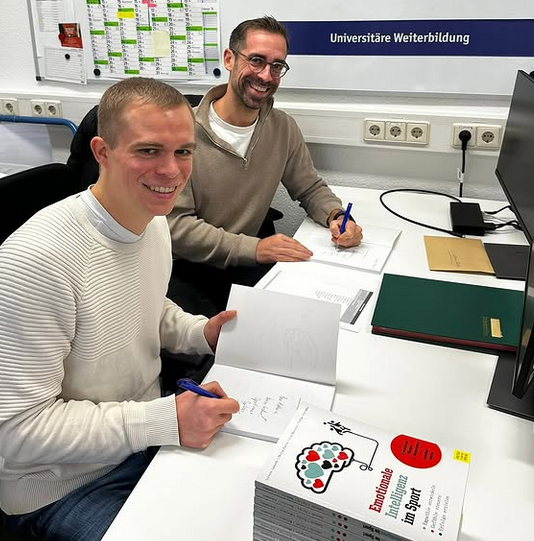 Dr Sylvain Laborde and PhD student Stefan Ackermann signing their book on emotional intelligence